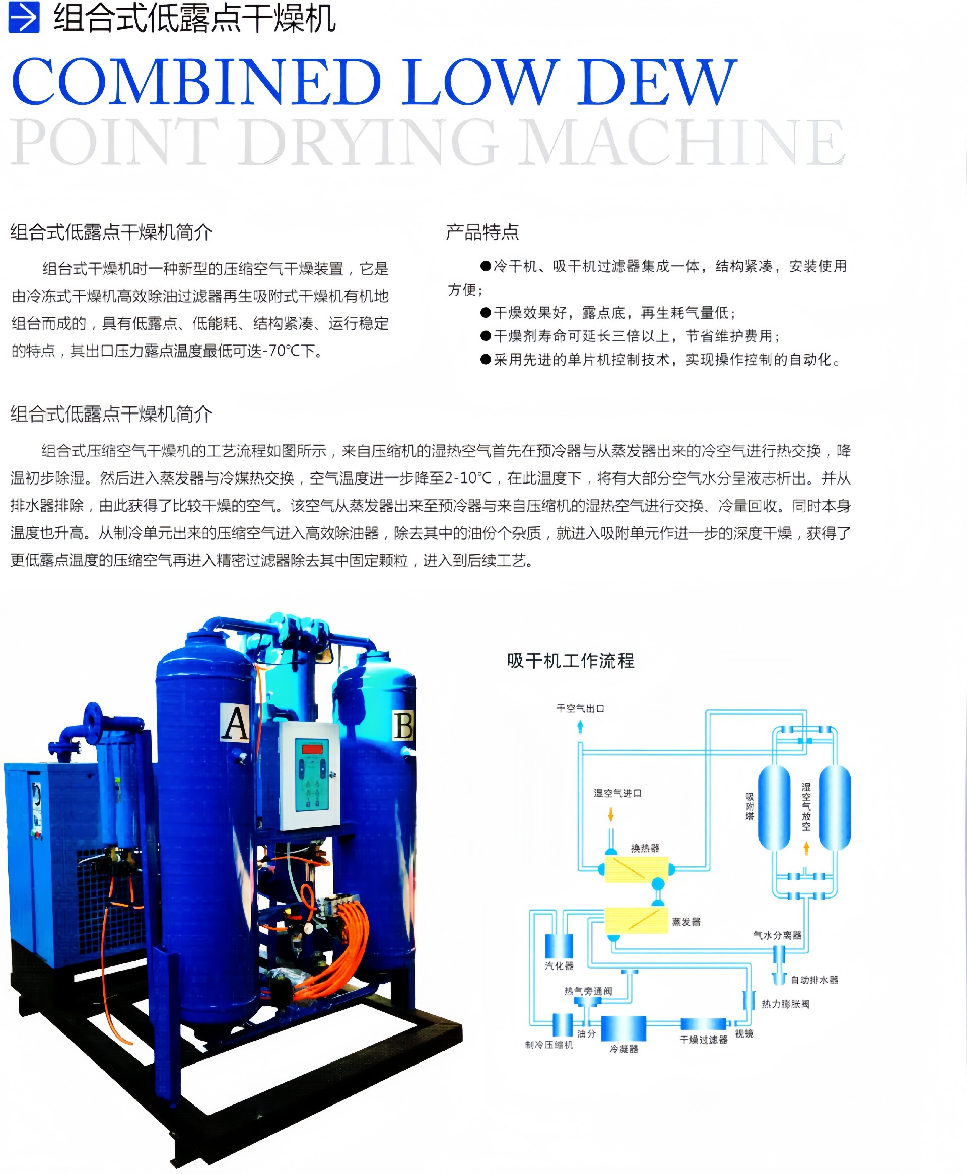 组合式低露点干燥机由冷冻式干燥机与吸附式(无热或有热)干燥机通过合理的管路连接和容积搭配而成。冷冻式干燥机的除水能力强,运行能耗较低,无气量损耗,与吸附式干燥机能达到较低露点的特点结合,较大限度地发挥二者的优点,在压缩空气进入吸附式干燥机前,先用冷冻式干燥机进行前置预处理,让大量水分在冷冻式干燥机里先行除去,再进入吸附式干燥机作深度干燥,能够达到很低的压力露点,较低可达-70℃。它利用冷冻式干燥机的强大除水能力使干燥塔进水负荷大幅降低,经冷干处理后进入吸附塔的水份为普通干燥机的20%左右,在其它条件不变的情况下,用于吸纳水蒸气的低露点干燥空气也可以相同幅度的下降。即再生气量约为普通吸附式干燥机的1/5,从而确实为降低再生能耗,特别是节约再生气能耗创造了条件。从而达到了较佳经济运行点和高品质的低露点成品气。